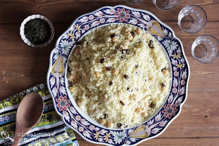 My only couscous tip when cooking the boxed version is to place it (uncooked) in a shallow dish, so that whatever amount you are cooking is spread wide instead of deep. Add the boiling salted water, cover with plastic wrap and waot 5 minutes before fluffing. What this method does is reduce the “squeeshing” of the grains, they turn out a little fluffier, not as good as steamed, but better than the regular cooking. I guess I should probably mention that next time I blog about couscous…