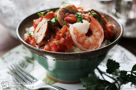 Next, add remaining ingredients and simmer until thick and saucy all at once – about 3o minutes (more if you used wine). Serve over rice. I added browned sausage and shrimp for a bit of extra oomph.