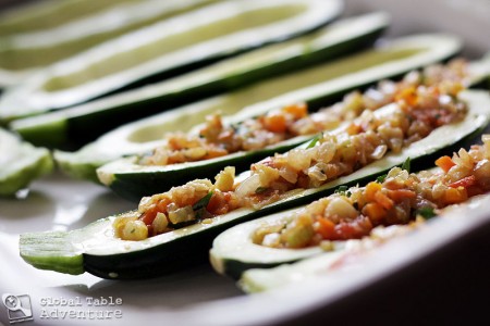 NOTE: Most authentic recipes call for tomato juice mixed with a spoonful or two of vinegar on the bottom of you casserole pan. Instead I opted for a plain tomato sauce to add textural oomph, but the choice is yours. Also, if you use large zucchini you might need to make more stuffing than I did – just double the recipe (leftovers will be great on rice).