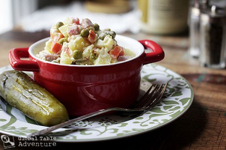 Of course, I’m a fan of anything potato. And why not? From what I can tell, potato salad is an epic world traveler. These last couple of years I’ve found versions everywhere, from the Dutch Potato Salad with apples, New Zealand’s version with bacon and sweet potatoes, and the Pacific version with bananas and sweet potatoes. Today’s mega Russian version is loaded up with carrots, eggs, peas, pickles, and ham.