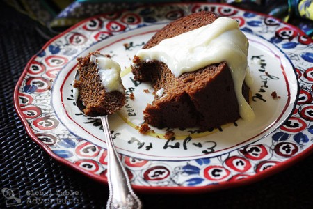 Add the flour and the burnt sugar mixture, alternating about 1/3 of each at a time, scraping sides as needed. When batter is smooth, pour into prepared bundt pan. Cover tightly with foil and bake for about 1 hour – 1 hour & 15 minutes